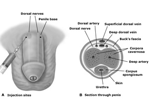 Сначала всегда нужно попробовать нехирургические методы лечения. В одно из кавернозных тел вводится игла 19-го калибра. (Перегородка между кавернозными телами неполная, и вход в одну сторону обеспечивает доступ к обоим кавернозным телам.) Кровь аспирируют и отсылают для определения газового состава, чтобы установить степень ишемии. Затем аспирируют 10-15 мл крови из кавернозных тел, сливают ее и замещают равным количеством нормального физиологического раствора. Этот процесс повторяют до тех пор, пока аспирированная кровь не приобретает ярко-красный цвет. Приготавливают раствор для инъекций, разводя 1 мл препарата, содержащий 10 мг фенилэфрина, в 100 мл нормального физиологического раствора Затем 3-5 мл этого раствора вводят в кавернозные тела. Процедуру повторяют через каждые 10 мин до тех пор, пока эрекция не прекратится. Во время этой процедуры необходимо измерять уровень артериального давления и пульс пациента.